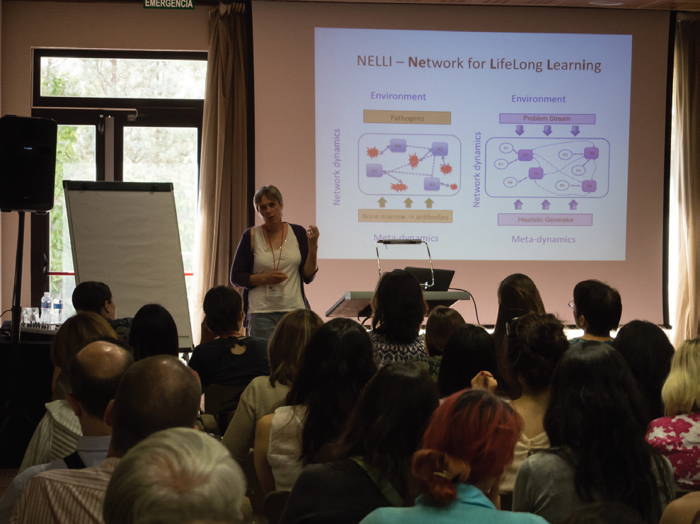 GECCO 2015 hosted the third edition of the women@GECCO workshop, with a continued and increasing high participation rate. More than 60 colleagues including both women and men, participated in the workshop and the associated work-life-panel discussion. The program started off with an invited talk by Prof. Emma Hart, head of the Centre for Algorithms, Visualisation and Evolving Systems at Edinburgh Napier University, on Lifelong Learning: An Academic & Personal Perspective. Emma gave an inspirational talk following her career journey, which involved moving from Chemistry to Evolutionary Computing to Artificial Immune System, to finally integrating these strands into her most recent research topic: life-long learning hyper-heuristics. She stressed the importance of people and collaborations in underpinning and supporting the life-long learning process of an academic career. Here is a photo snapped during her talk.